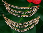 levate your ethnic ensemble with our exquisite Pearl-Studded Gold Ear Chains, a breathtaking fusion of traditional craftsmanship and contemporary elegance. These stunning Bahubali-style ear chains feature multiple cascading rows of lustrous freshwater pearls delicately suspended from intricately designed gold-plated chains, creating a mesmerizing waterfall effect that frames your face beautifully.Handcrafted by skilled artisans, each piece showcases exceptional attention to detail with its perfect balance of golden sheen and pearl radiance. The lightweight design ensures comfortable wear throughout long ceremonies and celebrations, while the secure ear hooks provide stability for worry-free movement.