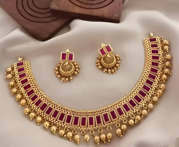 Elevate your ethnic look with this stunning handcrafted gold-plated choker necklace set, featuring rich ruby red stones and intricate bead detailing. Inspired by traditional Indian jewelry, this ethnic choker necklace is designed to exude royalty and elegance, making it a perfect choice for weddings, festivals, and special occasions. Key Features: