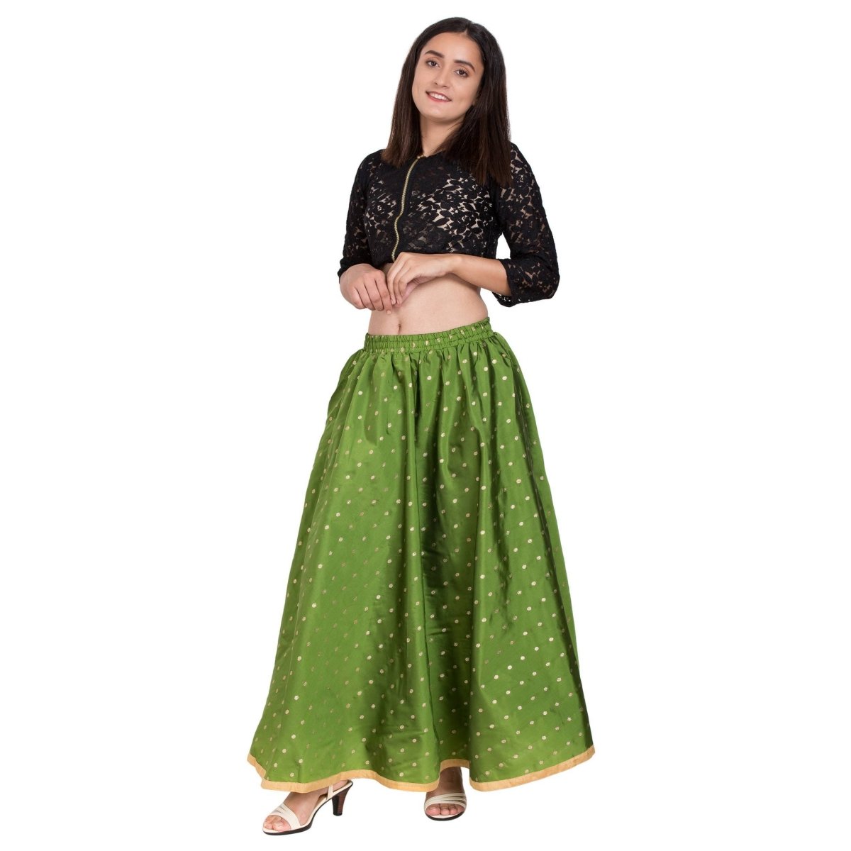 The Stylish Full Flared Maxi Skirt made of Satan Fabric with Full elastic at the waist which makes comfortable for wearing. A beautiful Dotted designed with Full of Zari Work and Embellished round with Golden Lace at bottom add grace to your personality.Perfect finishing and good quality of Maxi Skirt,Keep your style breezy and chic.