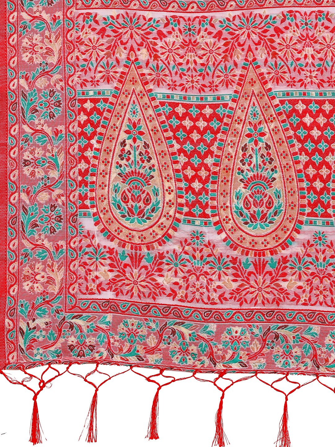 Step into elegance with this vibrant White Jacquard Linen Cotton Saree featuring a traditional multicolor woven pattern and playful tassel pallu. Its breathable fabric and timeless design make it a stunning choice for festivals, casual events, and daily elegance.