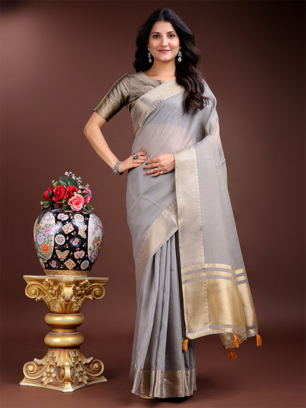 Astita Grey Cotton Woven Zari Work Traditional Tassel Saree