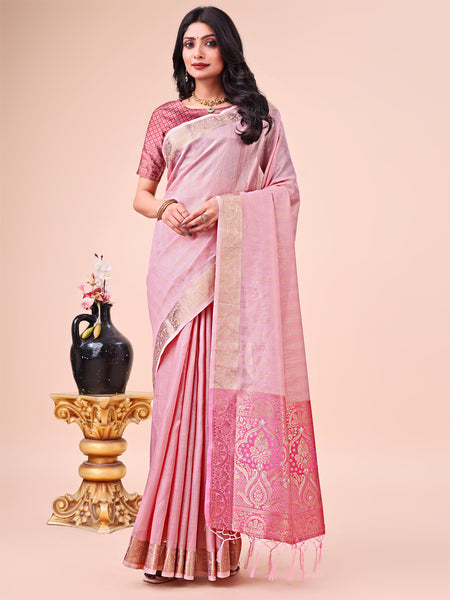 Experience timeless grace in this Pink Organza Saree, intricately woven with zari borders and traditional motifs. With its sheer texture, elegant drape, and delicate shine, this saree is perfect for occasions where you want to look effortlessly regal. Its soothing Pink shade and ornate pallu elevate your ethnic charm, making every moment feel special.