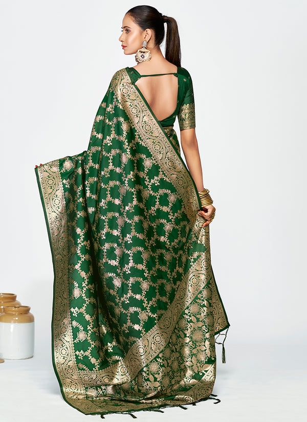 Vellora Emerald Green Banarasi Silk Saree with Rich Golden Zari Weaving - Free Size