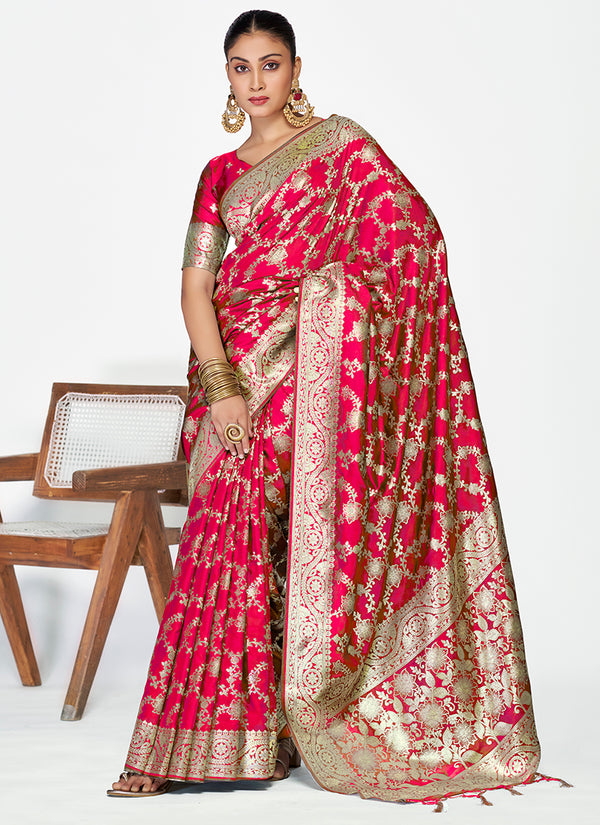 Vellora Rani Pink Banarasi Soft Silk Saree with Heavy Golden Jaal Weaving
