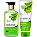 The perfect duo of Body Wash and Body Lotion is your skincare go-to for soft & hydrated skin. Formulated with Aloe Vera, Green Tea & Cucumber, they will nourish your skin from deep within and help you glow from the outside. This effective combination of ingredients will help soothe and calm the outer layer. Aloe Vera is a nourishing ingredient that offers ample nutrition to your cells. Green Tea helps soothe the surface and further reduce skin irritation. Cucumber is a refreshing ingredient that helps calm the skin and rejuvenates it from within. The zesty combination will keep your skin healthy and resilient in the long run.
