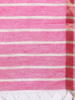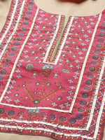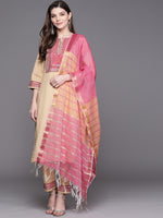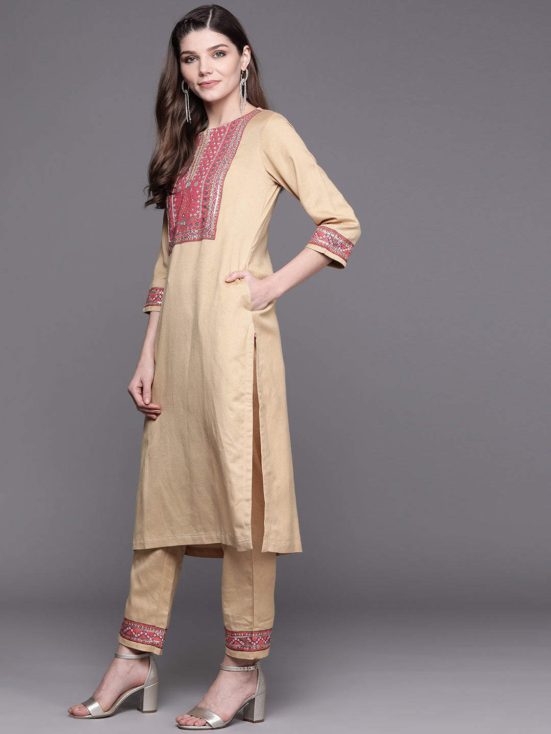 Beige and pink straight calf length kurta, has a round neck, three-quarter sleeves, side slits