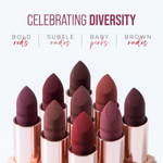 • For optimal results, prep and define your lips, swipe for an opaque matte pop, and create longer-lasting wear by blotting with tissue and dusting with setting powder.
