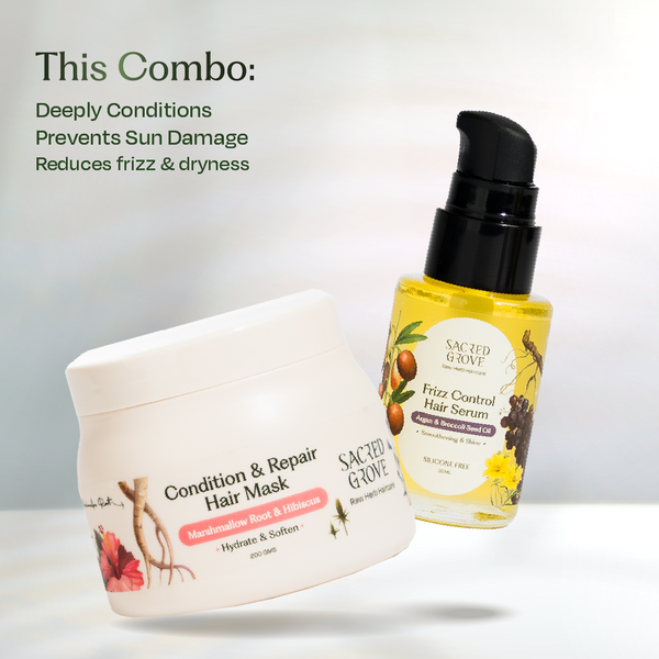 Scientifically designed ayurvedic solution for rough and dry hair. This combination contains the restorative powers of our Condition & Repair Mask with the smoothing benefits of our Frizz Control Serum. Formulated with a careful blend of raw herbs, including Marshmallow Root, Flaxseed, Hibiscus, Argan Oil, and Broccoli Seed Oil, this combo works to rebuild hair strength, repair damage, and restore hair's natural shine.