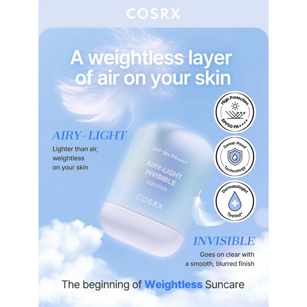 Cosrx Airy-Light Invisible Sun Stick SPF 50+ PA++++About the Product:A lightweight, transparent sunscreen stick that glides on effortlessly to prov...