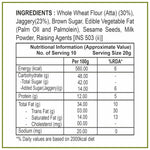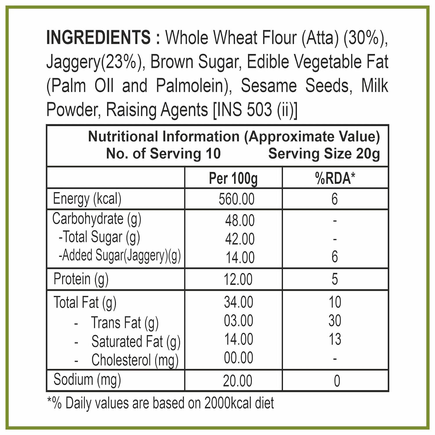 • As these are rich in dietary fiber, vitamins, and minerals, eating these delicious Gur Sesame Seed Cookies is a healthy choice! Dhampur Green takes pride in using traditional ingredients, grandma’s recipes, and homemade techniques using minimal processing. This recipe is all-natural and traditional with no preservatives. We use unadulterated, minimally refined, and all-natural ingredients With the rich sweetness of jaggery and the crunchy texture of Til, our healthy and natural Til Cookies will give you divine taste with every bite. Suitable for summers as well as winters because of the powerful warming properties of Til and Gur.