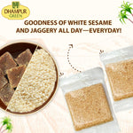 •  At the heart of this chikki is the alluring white sesame, which bestows a unique and nutty character to every bite. The delicate crunch and mild, earthy notes of these sesame seeds elevate the chikki, creating a texture and taste that's both satisfying and exceptionally wholesome.