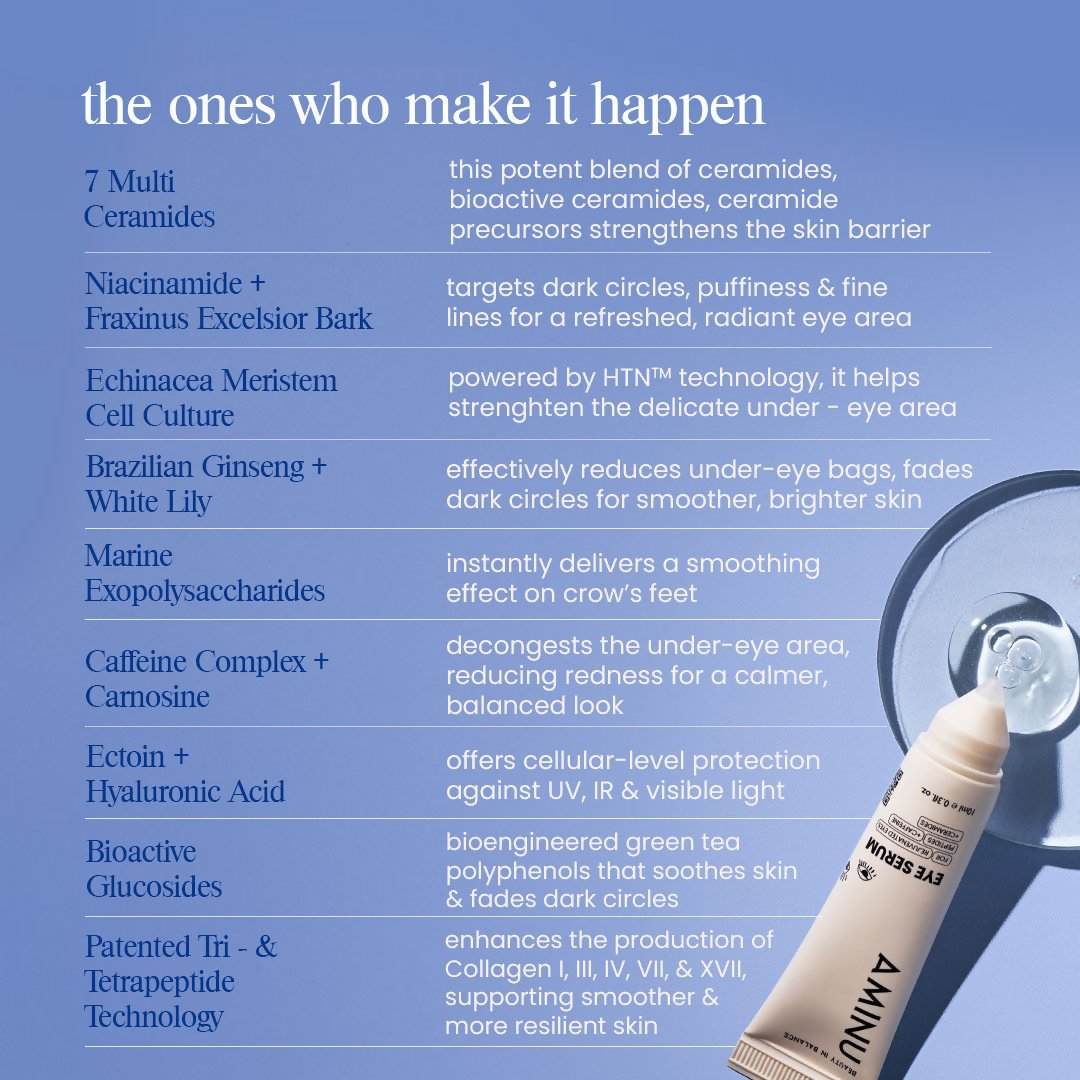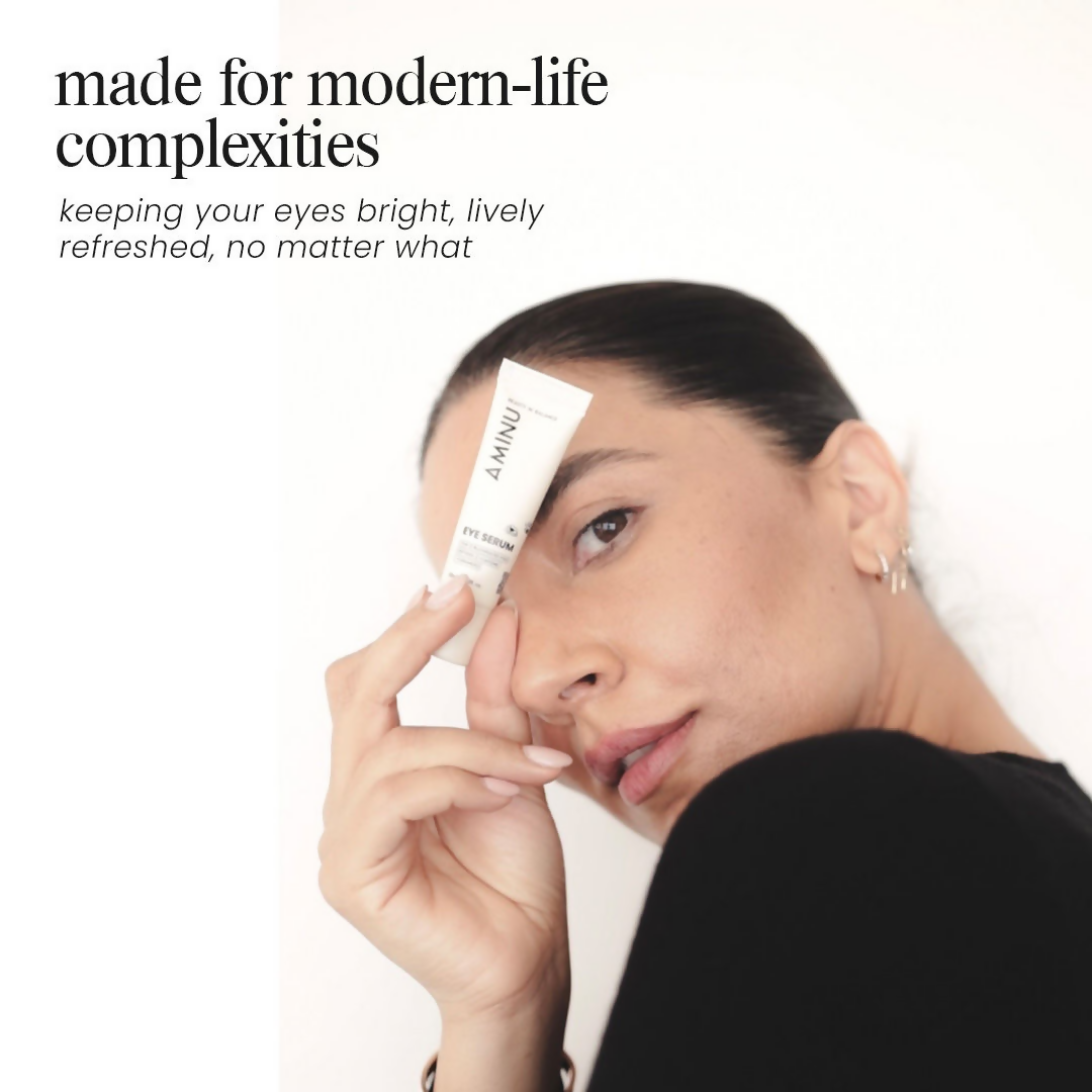 The eye area often carries the first signs of our lifestyle — long screen hours, late nights, and busy routines. Aminu Eye Serum is created with this in mind, bringing together over 20 carefully selected ingredients like ceramides, peptides, caffeine complex, and echinacea stem cells. The lightweight texture makes it easy to apply and comfortable to wear, whether on its own or under makeup.