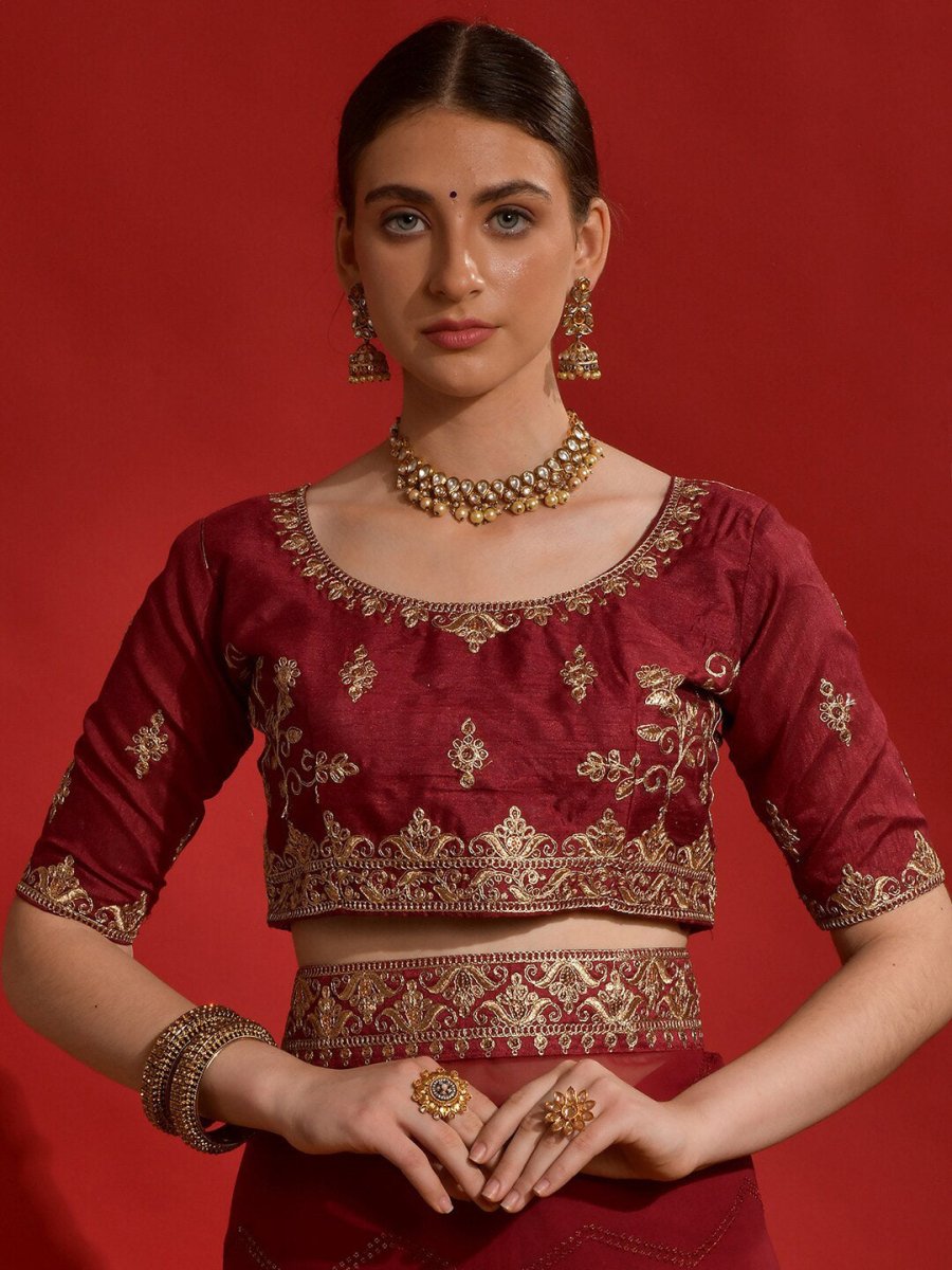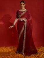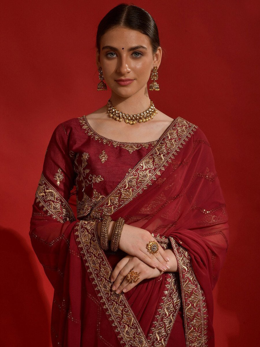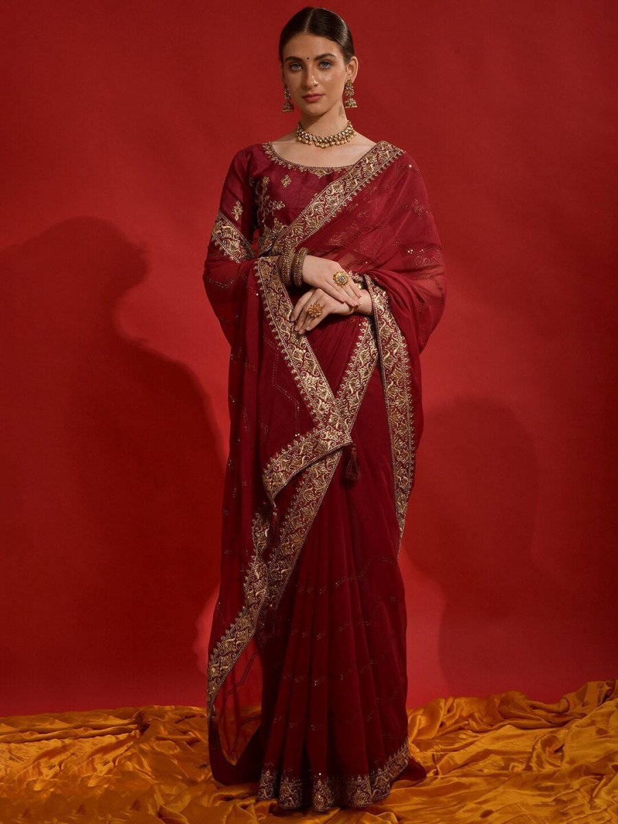 Anouk Maroon & Gold-Toned Embellished Embroidered Pure Georgette Saree - Distacart