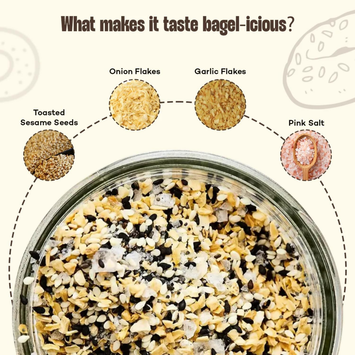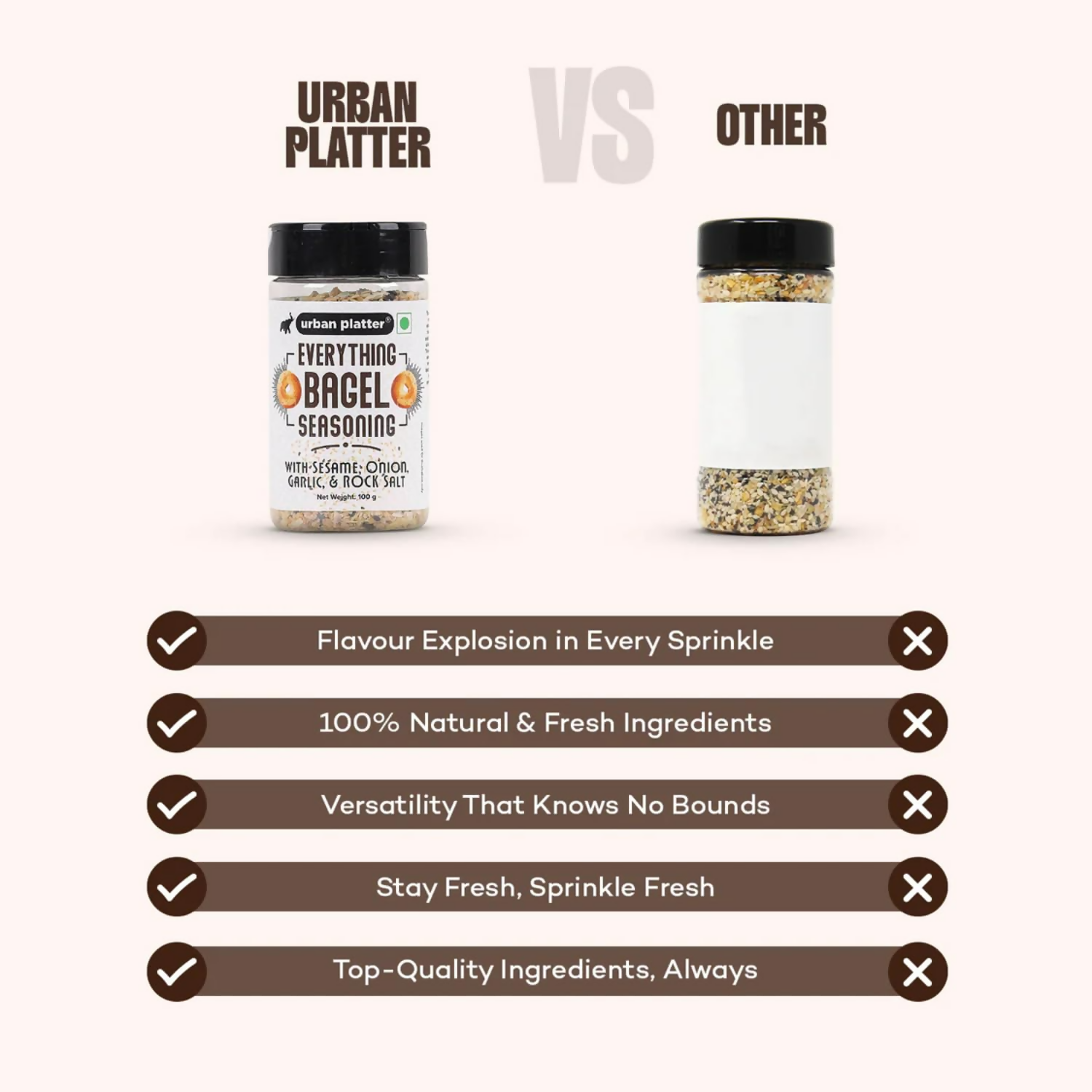 Urban Platter Everything Bagel Seasoning is a ready-to-use spice blend inspired by the popular topping mix used on classic bagels. It combines a mix of toasted sesame seeds, black sesame seeds, poppy seeds, garlic granules, white onion flakes, and pink salt.