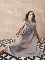 Crafted from soft linen in a muted grey shade, this round pleat bow dress exudes understated elegance. The round pleats create a structured silhouette, while the bow detail adds a whimsical and chic flair. Its neutral tone makes it versatile enough for both daytime and evening events, where comfort and style come together effortlessly.