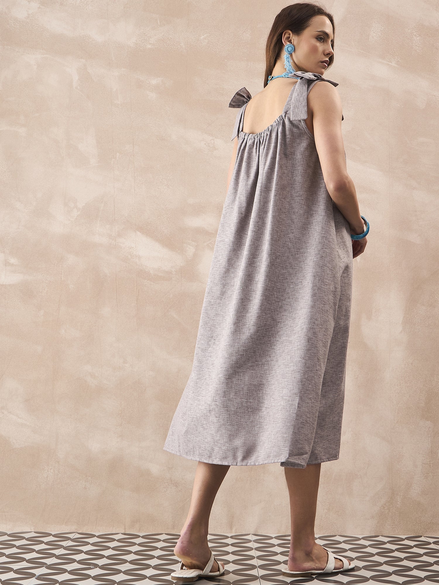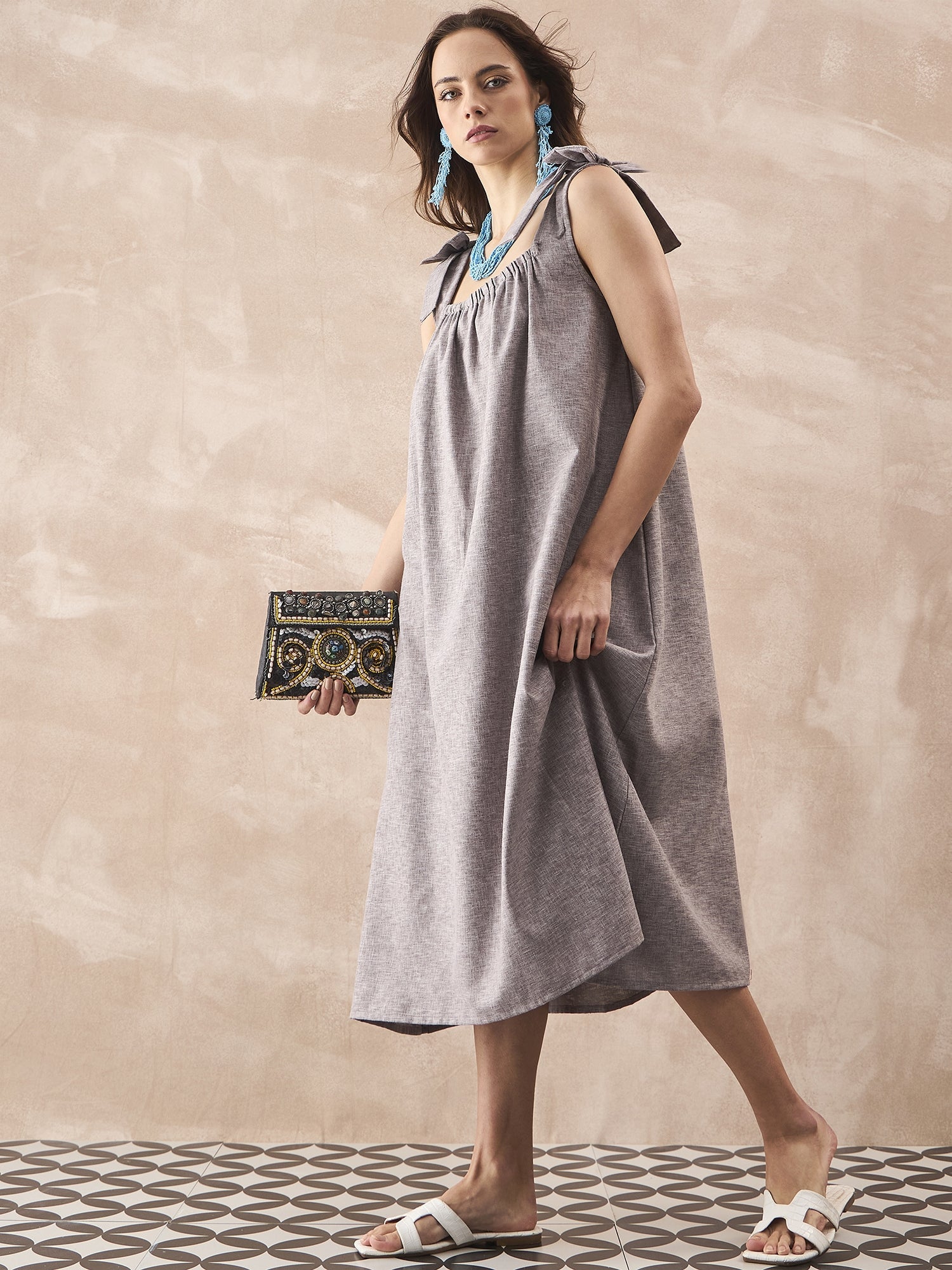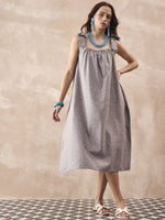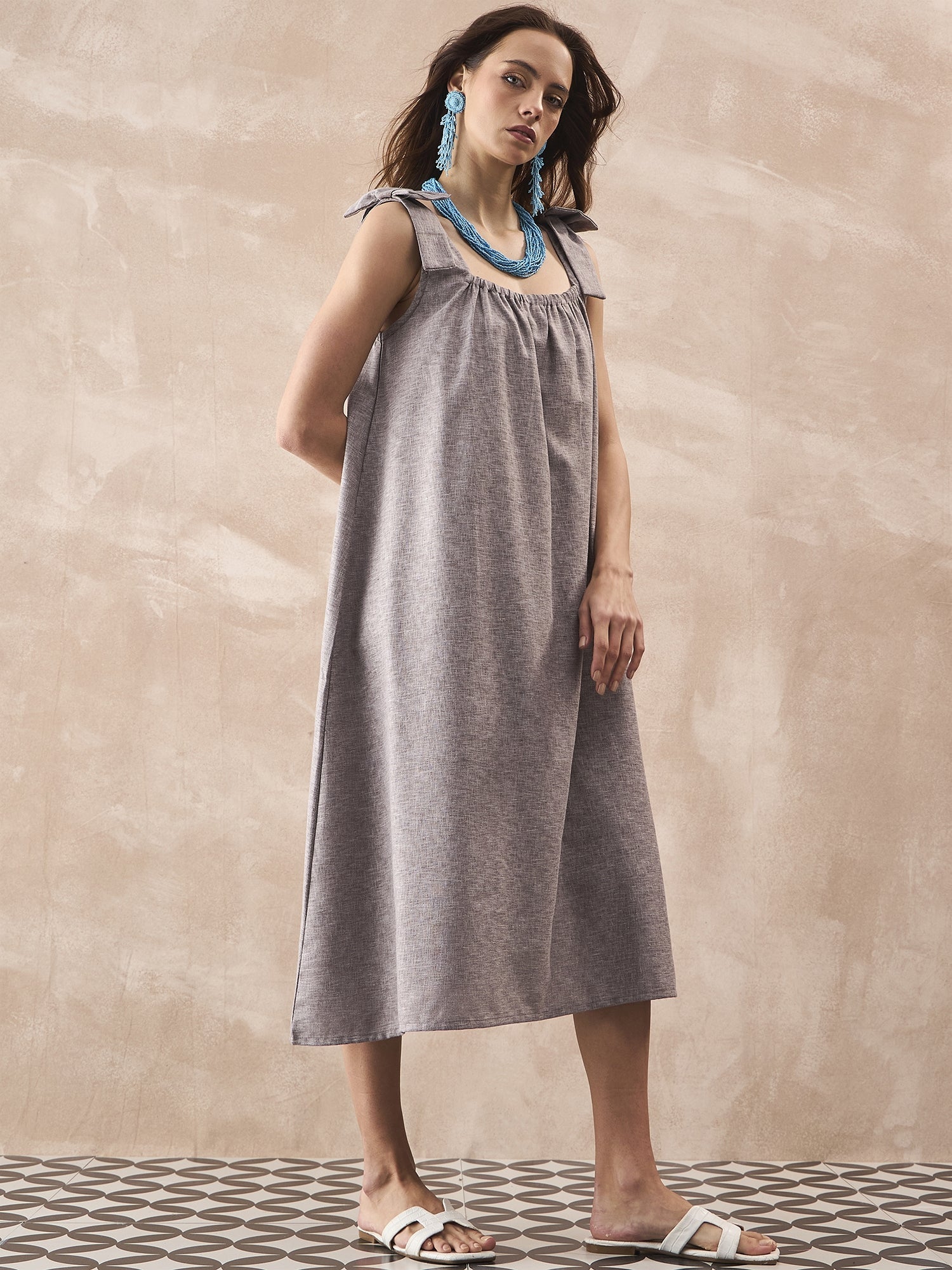 InWeave Dull Grey Linen Pleat Bow Dress - Distacart