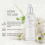 • Apply to clean skin. Soak a cotton pad with toner and wipe over the face and neck.