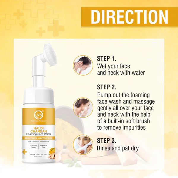 Nuerma Science Haldi Chandan Foaming Face Wash is a luxurious cleanser designed to provide a radiant and spotless complexion. This 150 ml foaming face wash combines the powerful benefits of Turmeric, Vitamin C, and Sandalwood to brighten the skin, reduce acne, and improve skin texture, leaving your skin clear, youthful, and glowing.