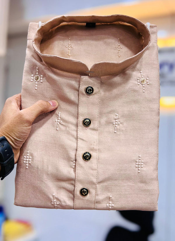 Prazu Fashion Light Peach Silk Embroidered Kurta With PajamaAbout the Product: GENDER : male Colour : Light Peach Work/Pattern : Embroidered Fabric...