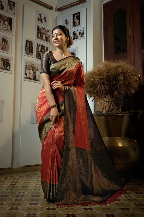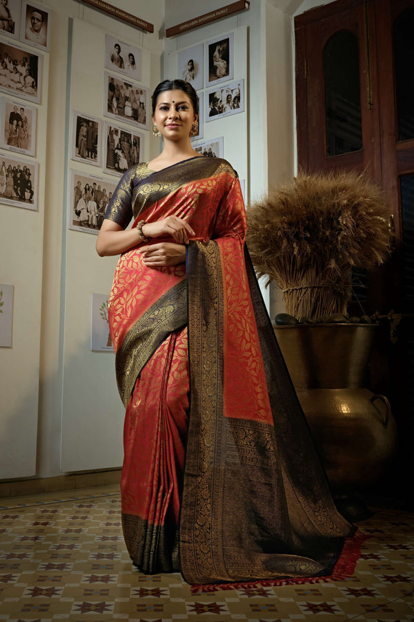 Looking for a dual-tone red saree? This mesmerizing Carmine Red shade kanjeevaram saree is the perfect catch for you!