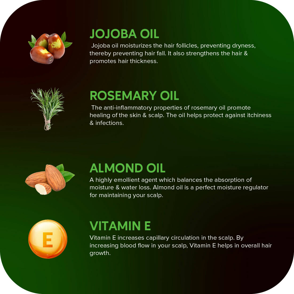 • Boosts Growth: Jojoba Oil moisturizes the hair follicles to strengthen them, promoting hair thickness. Consequently, it also avoids hair fall due to breakage and dryness.