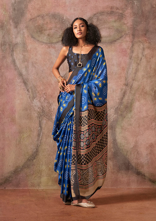 Fashion and style always depends on good color and fantastic combination of shades and so we create best shades to enhance your beauty and personality. Superb craftmanship of embellishments exhibited in this Black and blue satin georgette classic saree. This wonderful dress is showing some incredible ajrakh printed and bandhej design done with fancy work. Comes with matching blouse. (Slight variation in color, fabric & work is possible. Model images are only representative.)Legal Disclaimer :Product color may slightly vary due to photographic lighting sources or your monitor settings.