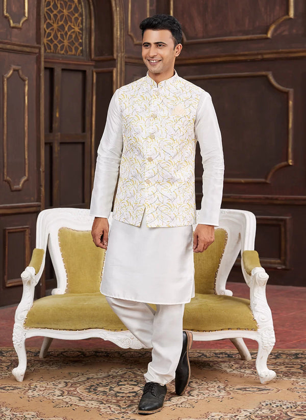 Make a statement this festive season with this refined Nehru jacket, beautifully paired with a timeless kurta pajama. Crafted from premium fabric, the ensemble merges traditional charm with contemporary sophistication. Ideal for weddings, celebrations, and formal events, it ensures effortless comfort while radiating a stylish, dignified presence. Enhance your wardrobe with this versatile outfit and enter every occasion with elegance and confidence.Legal Disclaimer : Product color may slightly vary due to photographic lighting sources or your monitor settings.