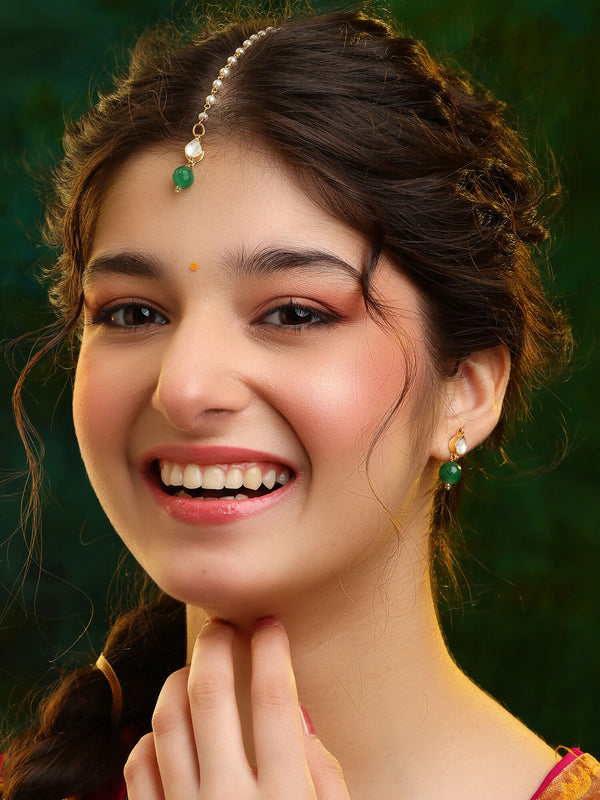 The sparkling work in the pair of gold-toned earrings with a matching maang tikka of emerald green beads and kundan-style embellishments provides an elegant appearance. This type of traditional Indian jewellery set is often used for festive occasions, weddings, and parties, complementing ethnic wear. It is crafted from a gold-plated brass metal framework. Just style it with your next matching ethnic wear.