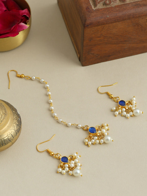 Adorned with pearls and vibrant blue stones, this exquisite maang tikka and earring set captures the essence of traditional charm with a modern, sparkling twist.Perfect for illuminating any special occasion, the set radiates warmth and happiness. The craftsmanship and thoughtful design make it a cherished accessory, designed to make any moment feel a little more magical.Legal Disclaimer : Product color may slightly vary due to photographic lighting sources or your monitor settings.