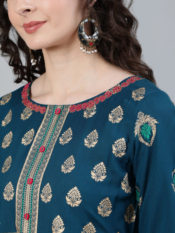 Jaipur Kurti Women Turquoise Blue & Gold Ethnic Motifs Printed Handloom Anarkali Kurta