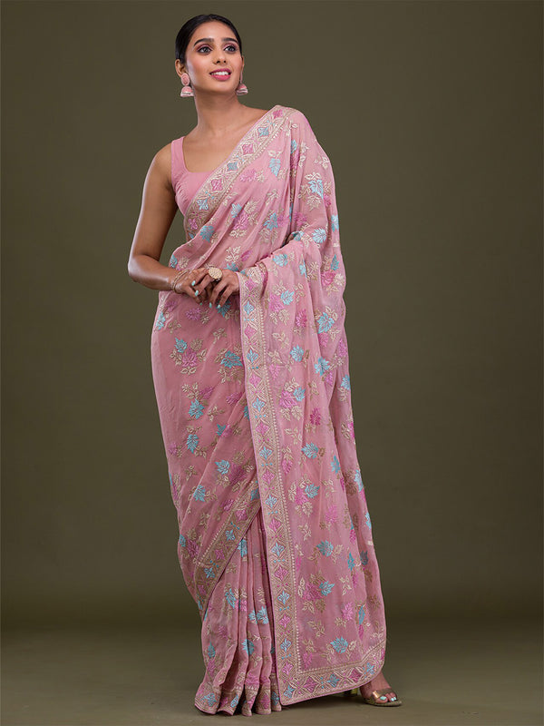 - Pink, blue & gold toned saree
