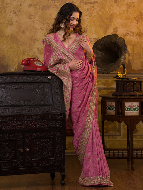 Koskii Pink & Gold-Toned Floral Embroidered Art Silk Saree