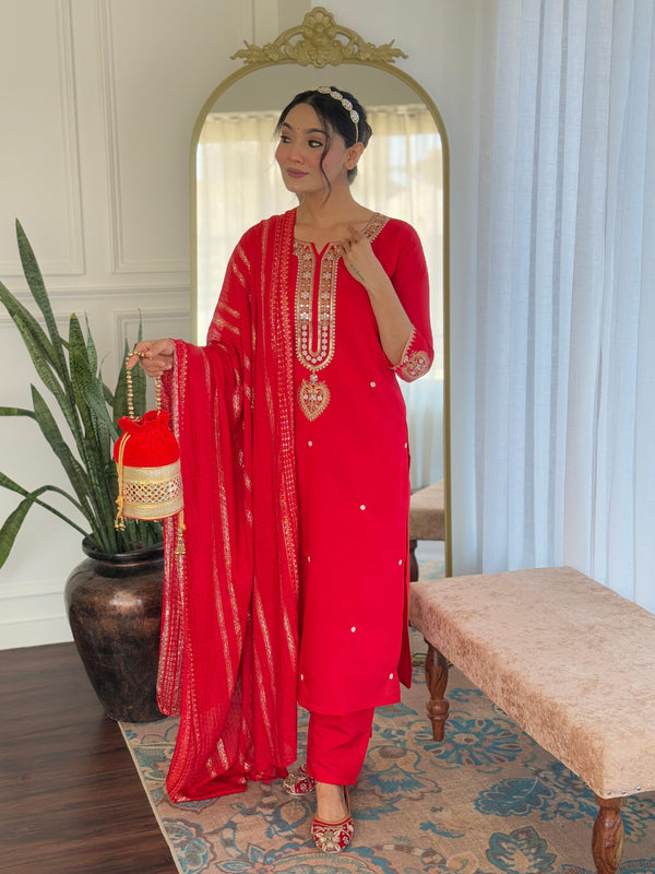 Sonakshi Women's Red Viscose Chanderi Kurta Set with Dupatta