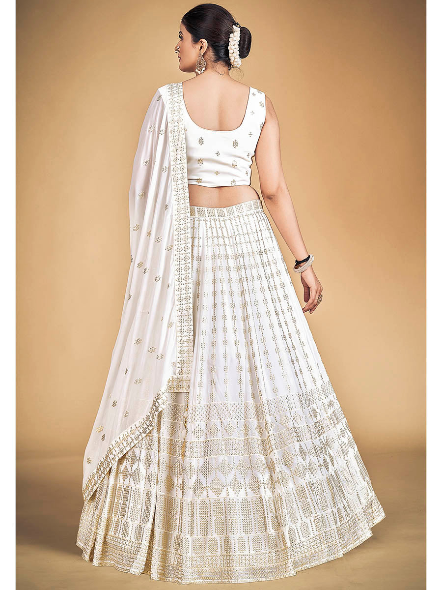 White Georgette Real Georgette Lehenga Choli features a georgette lehenga and georgette choli with georgette dupatta. Embroidery is completed with thread and sequins. This Style is made i India and checked by hand to ensure high quality.