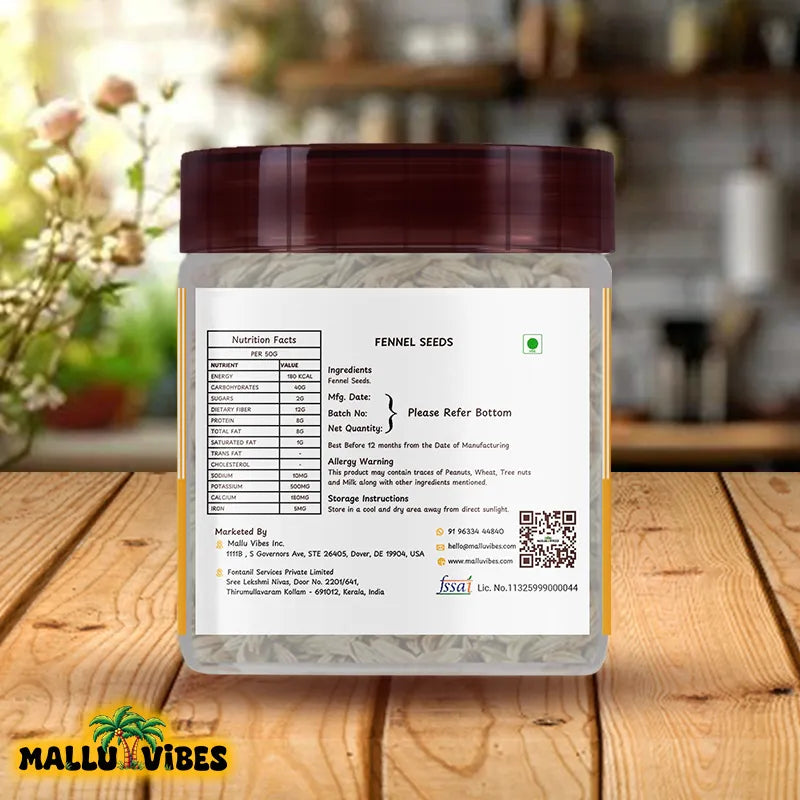 Fennel Seeds (Perunjeerakam) have a Sweet, licorice-like Flavor, commonly used in Kerala Cuisine to season Curries, Rice dishes, and Stews for a fragrant, Aromatic Touch.