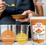 Haldi powder ( Turmeric ) is an integral part and heart of Indian cuisine. It is a necessity in almost every Indian household and is coined as the most powerful spices of all since ancient times. Nanak Haldi powder is made from carefully selected Turmeric , hygienically pulverized and cautiously packed with utmost care to retain its freshness and flavour.