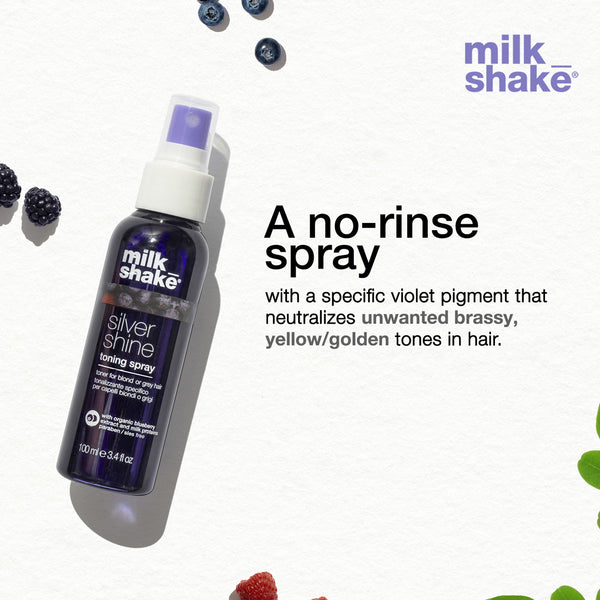 Milkshake silver shine toning spray is a leave-in spray with a specific violet pigment that neutralizes unwanted yellow/golden tones in hair. It strengthens and hydrates hair, giving it a healthy appearance as well as detangling and improving manageability.