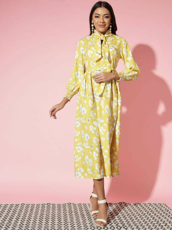 Myshka Women Yellow Floral Rayon A-Line Shirt Collar DressYellow Viscose Rayon Long Sleeves Shirt Collar A-Line Ankle Length Printed Printed Dress ...