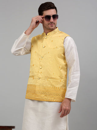 Jompers Men's Embroidered Nehru Jacket - YellowBrand Color : Yellow Collar Type : Mandarin Design/Pattern : Embroidered Sleeves Type : Sleeveless Wash Care and Material : Wash with mid detergent 70% Silk & 30% Cotton.Legal Disclaimer:  Product color may slightly vary due to photographic lighting sources or your monitor settings.