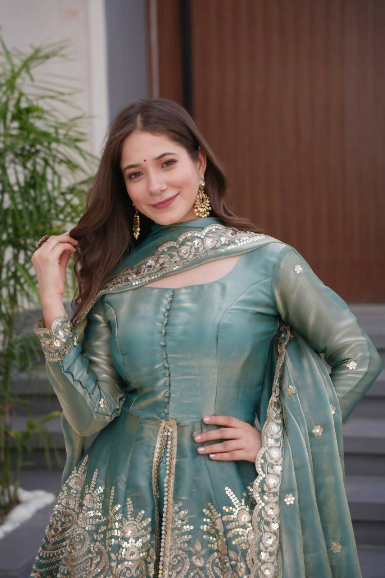 Elegant Heavy Two Tone Fendy Satin Silk Sharara Set featuring sequins, real mirror, and heavy embroidery work with stitched top, free-size sharara, and matching embroidered dupatta.