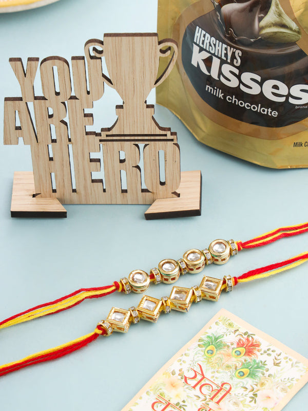• Style Note: Add a touch of royal elegance to Raksha Bandhan with this exquisite set of 2 multicolor Kundan thread rakhis from NVR Men. Each rakhi is beautifully adorned with sparkling Kundan work, perfectly complemented by vibrant threads that reflect the joy and warmth of the festival. Thoughtfully crafted to honor tradition while adding a stylish twist, this set is ideal for brothers who value both sentiment and sophistication. Accompanied by Roli, Chawal, Chandan, Mishri with Assorted MDF wooden stand & 33.6 gm Hershey's Kisses Chocolate, it completes the ritual with authenticity and grace. Make this Rakhi truly memorable with a blend of tradition, love, and timeless design.