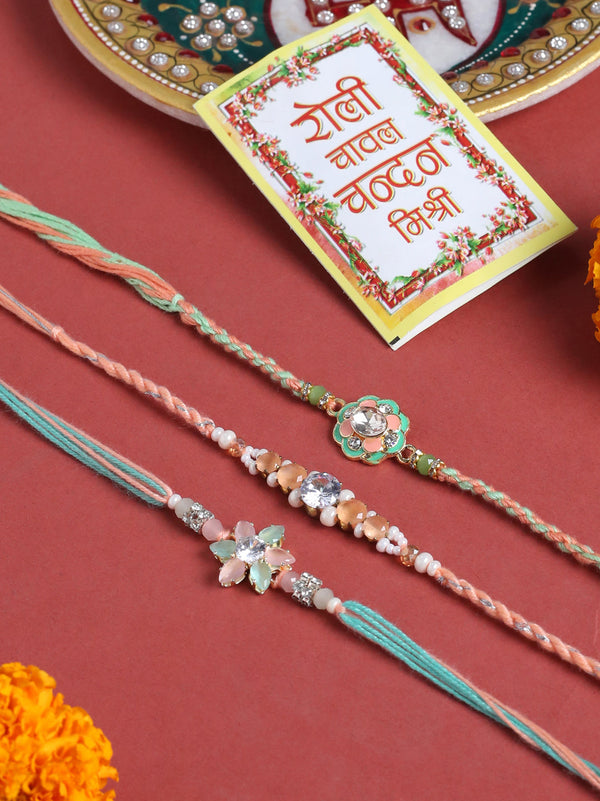 NVR Men Set of 3 Floral Design Multicolor Artificial Stones & Pearls Thread Rakhi with Roli Chawal Chandan & Mishri
