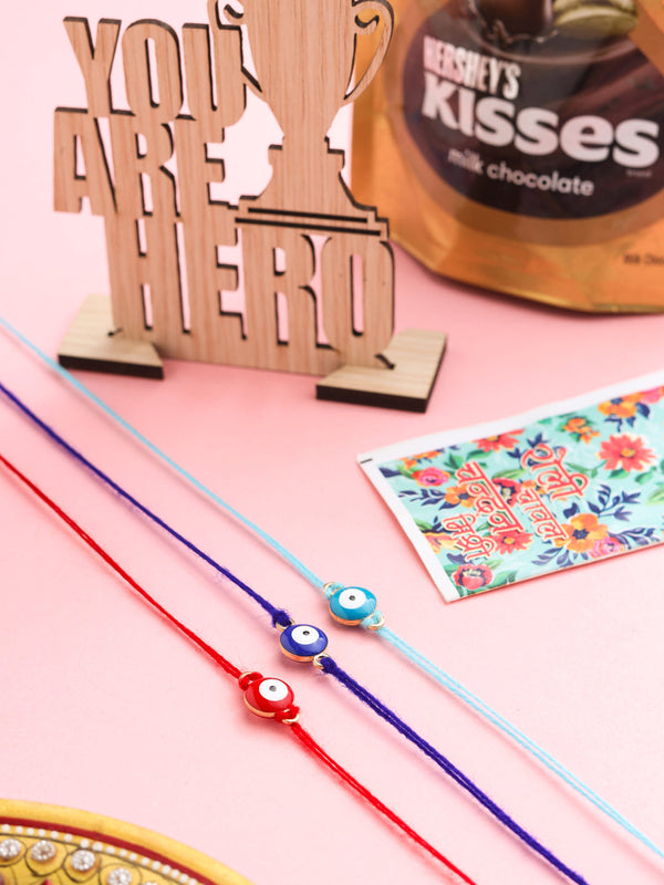 - Style Note: Add a touch of protection and tradition to your Raksha Bandhan celebrations with the NVR Set of 3 Multicolor Evil Eye Men’s Thread Rakhis. Featuring the powerful and symbolic Evil Eye design, these rakhis are crafted with vibrant multicolor threads that not only ward off negativity but also add a modern, stylish flair to the occasion. The intricate details of the Evil Eye charm make each rakhi unique, while the comfortable thread ensures they can be worn with ease. Complete with Roli, Chawal, Chandan, Mishri with Assorted MDF wooden stand & 33.6 gm Hershey's Kisses Chocolate, this set makes the perfect gift for brothers, combining the power of tradition with a touch of contemporary elegance.