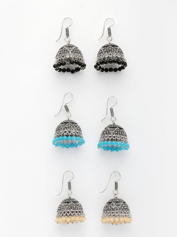 NVR Women Pair of 3 Multicolor Artificial Beads Oxidized Silver Plated Jhumka Earrings - One Size