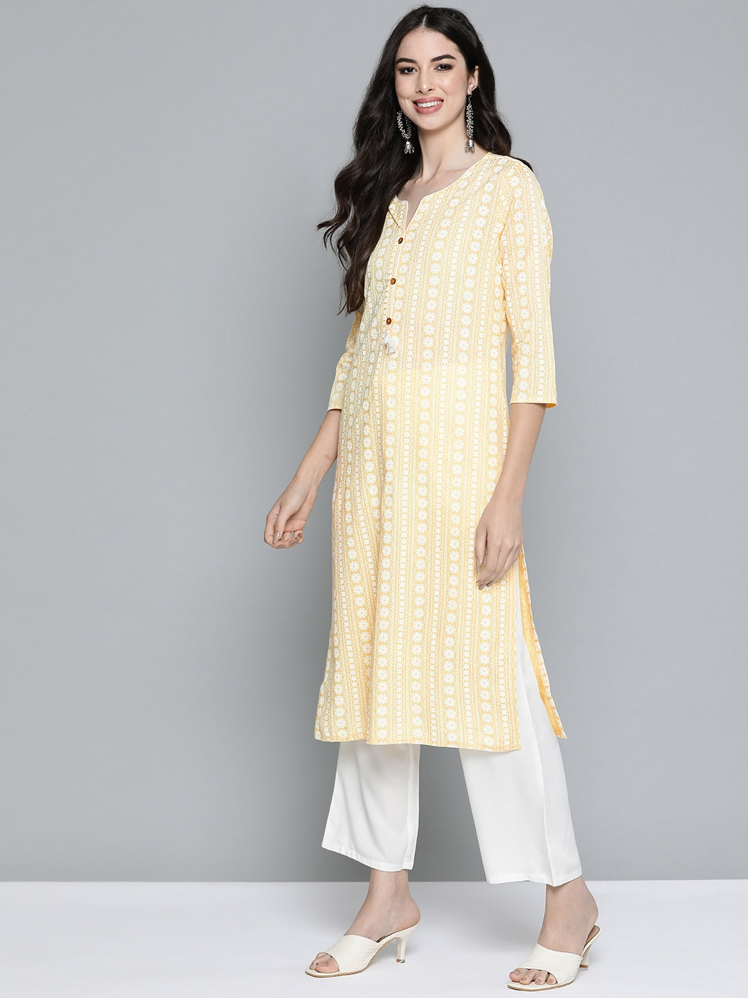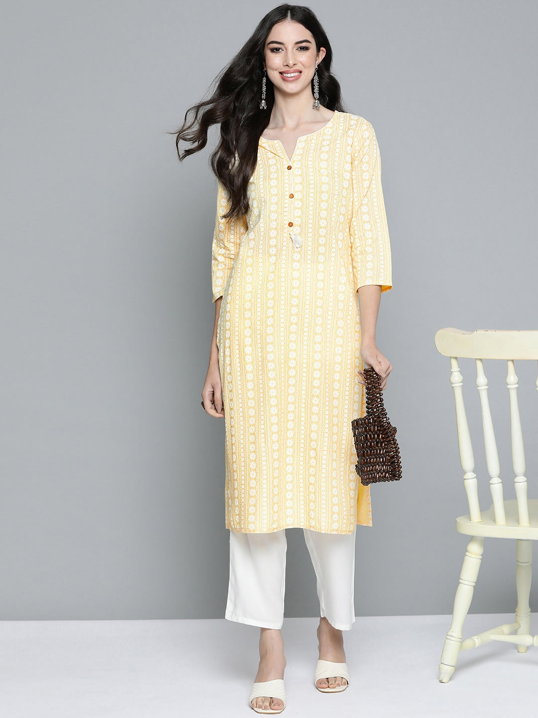 HERE&NOW Women Yellow & Off-White Printed Regular Kurta with Palazzos Product Details Yellow and off-white printed Kurta with PalazzosKu...