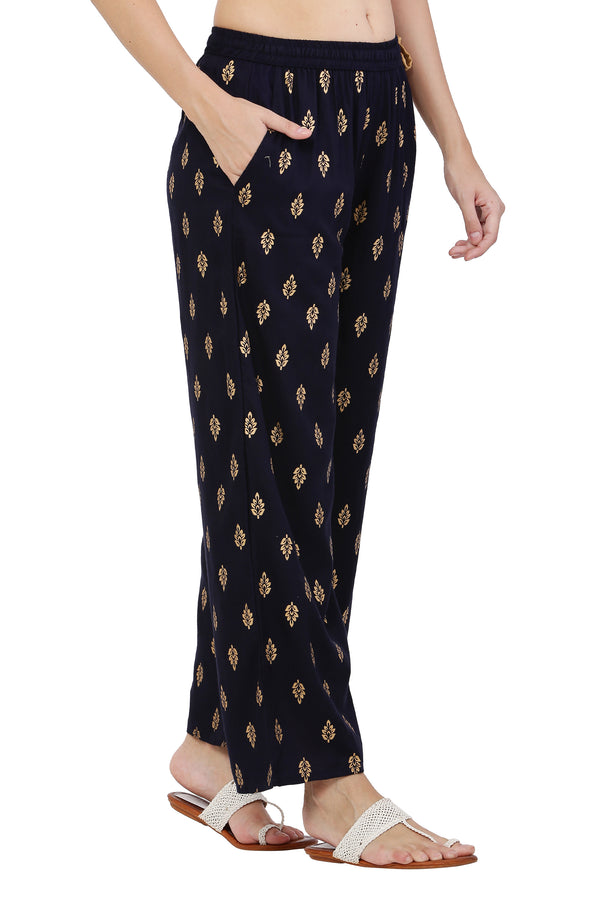 PAVONINE Black Color Full Golden Leaf Print Palazzo For Women Pant Additional Information: Highlights: Two Side Pockets, Straight Regular Fit ...
