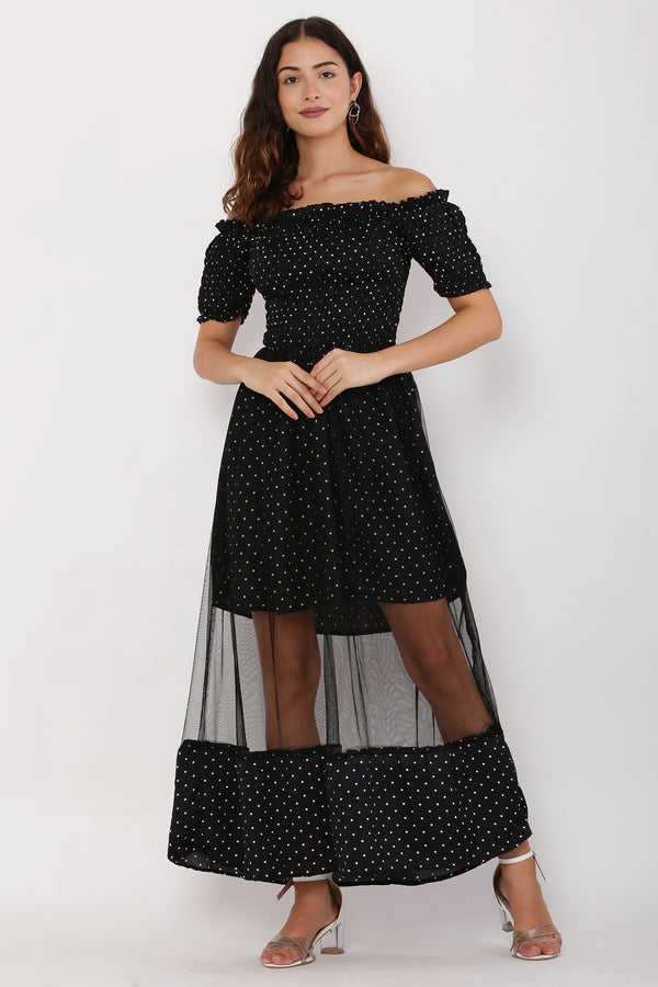 Smocking at bust, off-shoulder, net fabric at bottom.