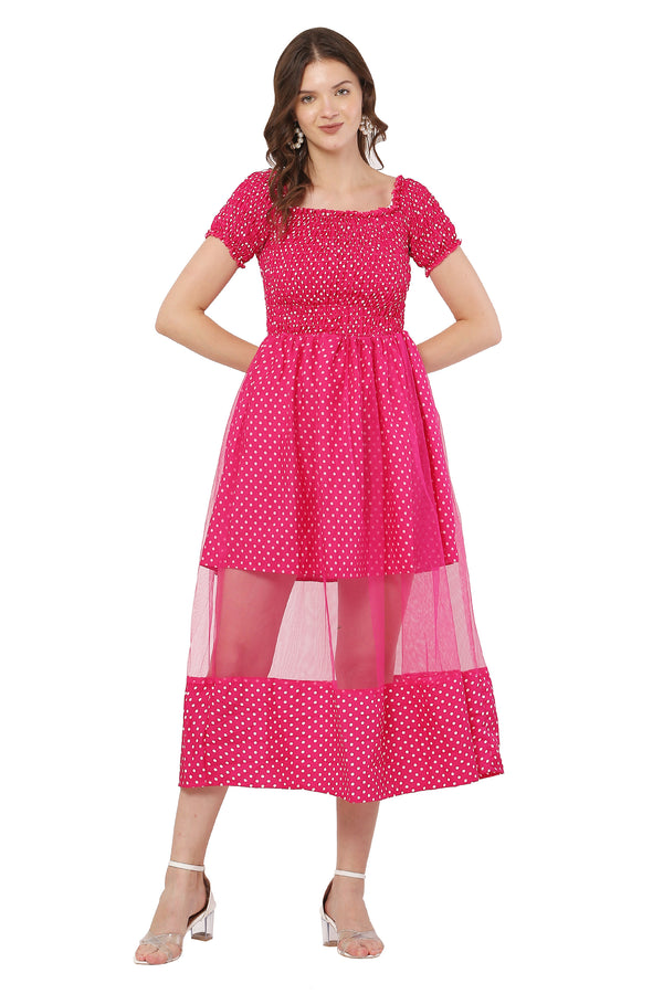 Smocking at bust, off-shoulder, net fabric at bottom.