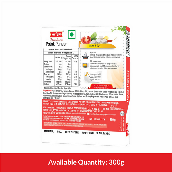 Priya Ready To Eat Palak PaneerAbout the Product:Priya’s Ready to Eat Palak Paneer is a mouthwatering  of the ever-reliable paneer at its softest b...