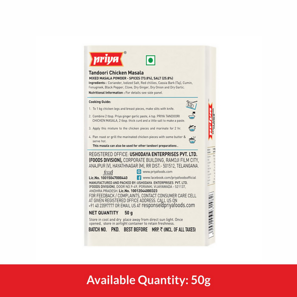 Priya Tandoori Chicken MasalaAbout the Product:Priya Tandoori Chicken Masala ensures you bring to the table an outrageously scrumptious version of ...